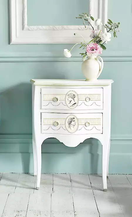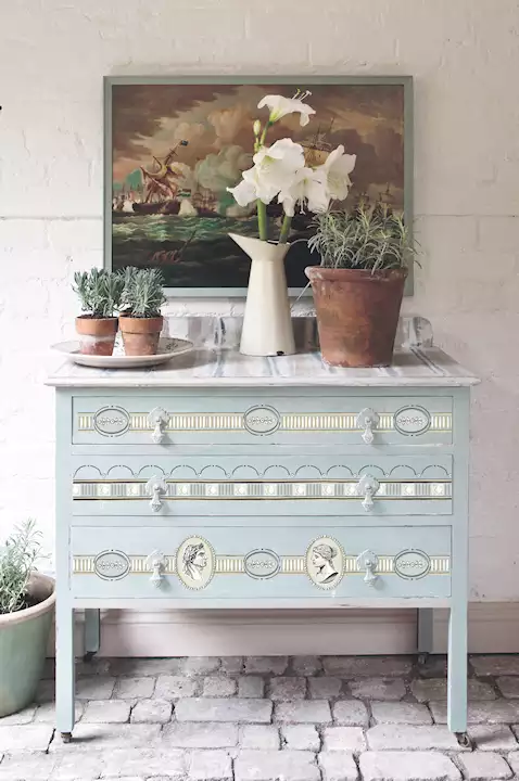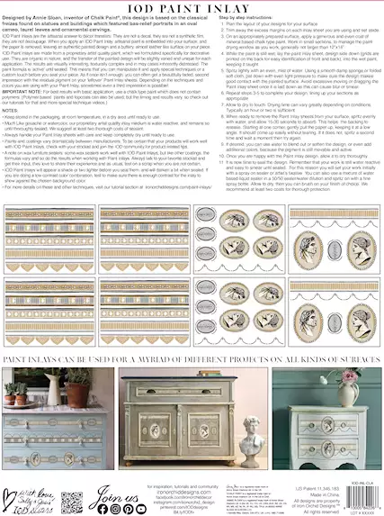 When you apply an IOD paint inlay, artisanal paint is embedded into your service in the paper is removed, leaving an authentic painted design and a buttery almost leather like surface on your piece. IOD paint and lays are made from a proprietary artist quality paint which we formulated specifically for decorative use. They are organic in nature and the transfer of the painted design will be slightly varied and unique for each individual.
