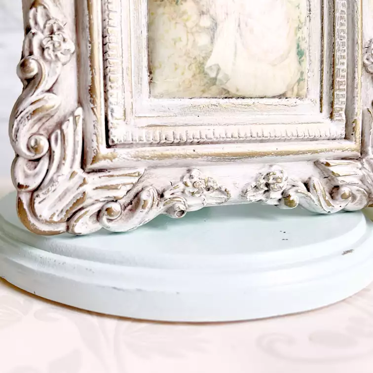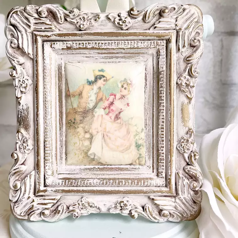 I think this French Country Romantic Faux Framed Art came out Gorgeous. I hand poured a blend of Plasters (my custom proprietary mix) for this Frame and then painted it with a White Chalk paint. After several coats of that I aged it with an antique wash and then added some European Gold Rub N Buff to highlight the Gorgeous details of this Lovely frame. Then I Decoupaged an Image of a Parisian Courting Couple that pairs Perfectly with this Elegant Frame. Once I decoupaged the Graphic onto the middle of the Plaster Frame I sealed it thoroughly for many years of display.