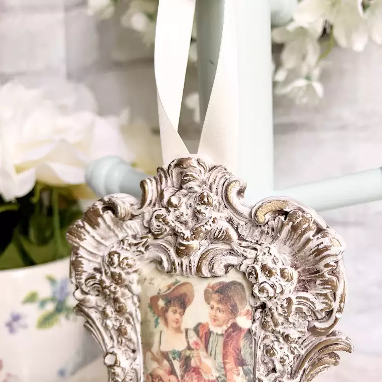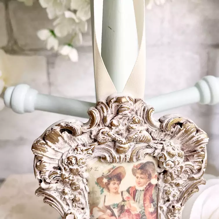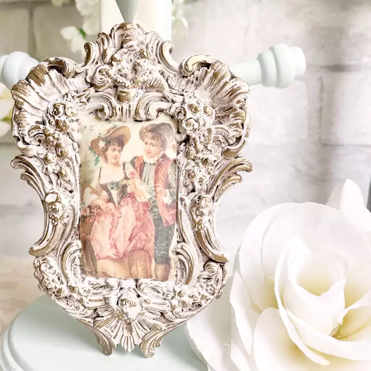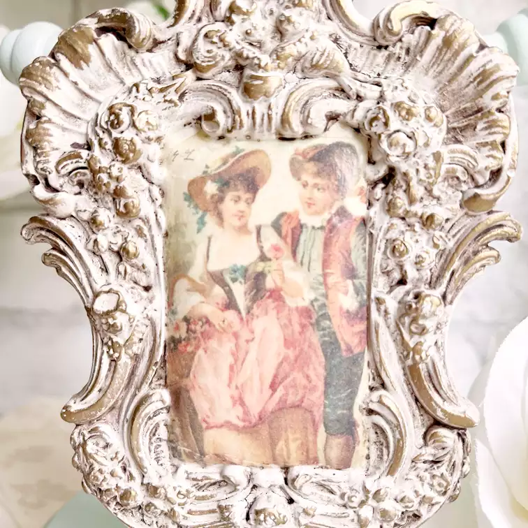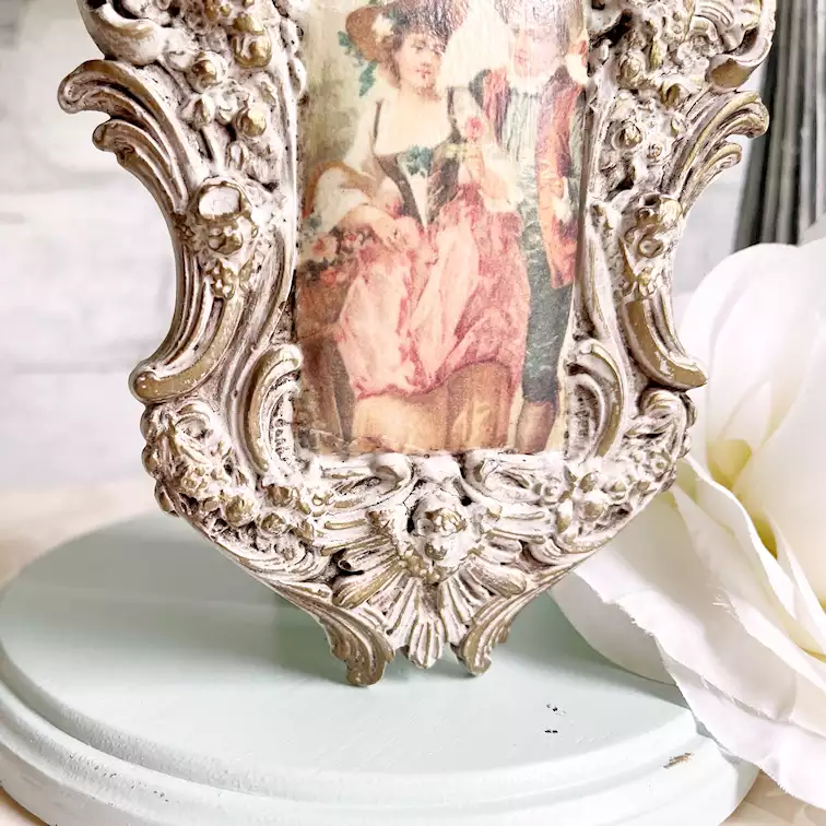 I think this French Country Romantic Faux Framed Art came out Gorgeous. I hand poured a blend of Plasters (my custom proprietary mix) Frame and then painted it with White Chalk Paint. After several coats of that and several coats of sealer I then did an Antiquing Wash and then added some European Gold Wax to highlight the Gorgeous details of this Lovely Cherub and Roses frame. Then I Decoupaged the French Courting Couple amidst Lush Pink Roses Image that pairs Perfectly with this Elegant Frame. Once I decoupaged the Image onto the middle of the Plaster Frame I sealed it thoroughly for many years of display.