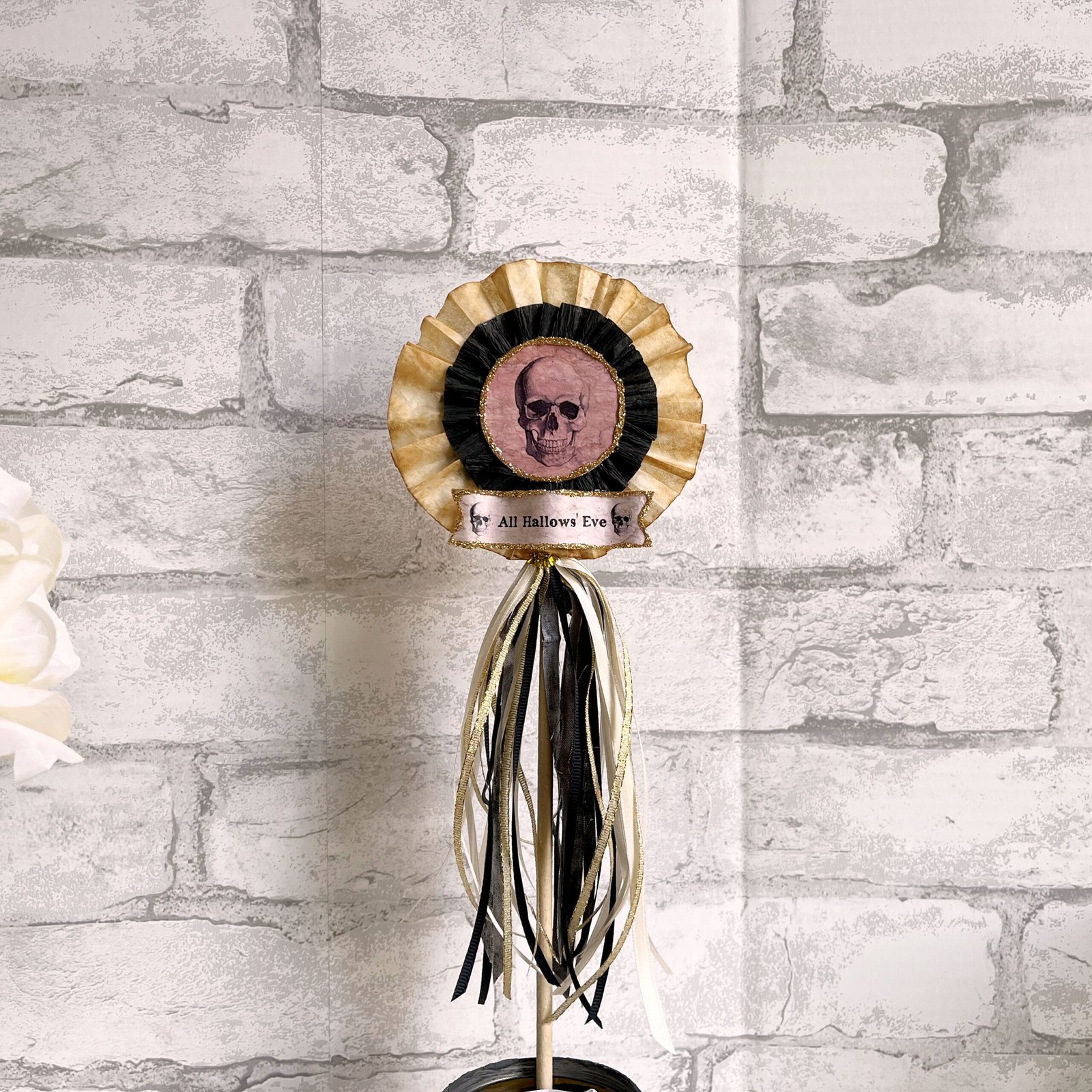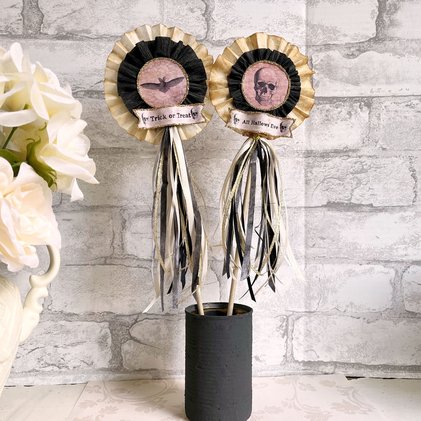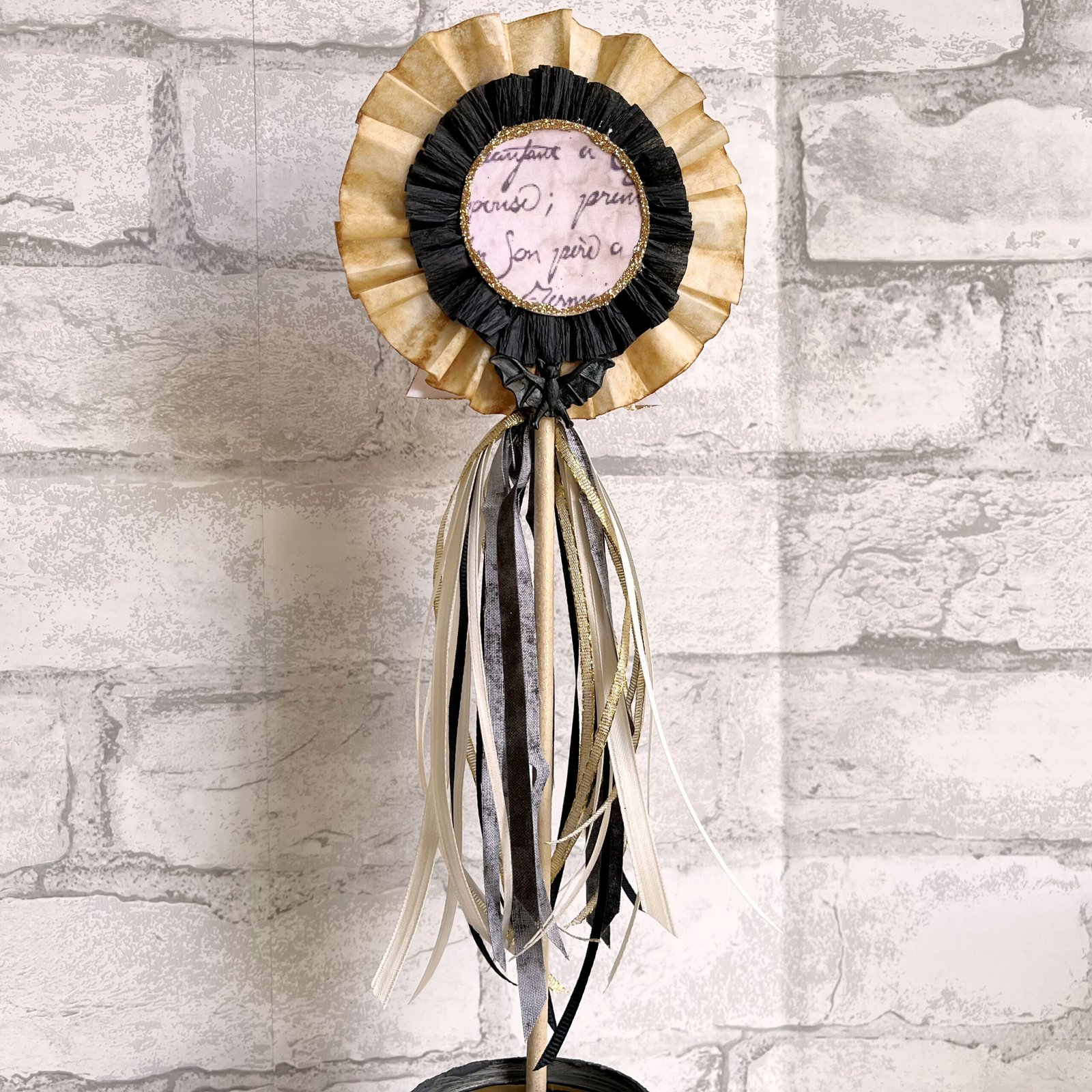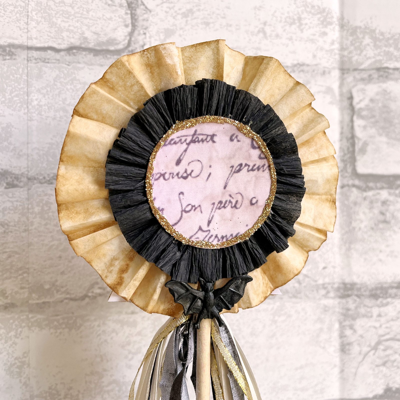 I absolutely Love how these turned out. This Vintage Style Halloween Faerie Wand features Coffee Stained coffee filters, Black Crepe Paper, Gold Glitter, Vintage Themed Graphic Images I created, Ribbons, Fabric and so much more. I hand glittered the edges of the Skull Image, the All Hallows’ Eve Banner and the Vintage French Writing image on the back. I hand ruffled/pleated the coffee filters and crepe paper. The extra long stick is painted in a Parchment color that is hand glittered, although I couldn’t get my camera to focus on it, but it is a clear holographic glitter that sparkles mostly green. I though it gave it that Eerie Vibe. The tassel is made from various Ribbons and thin strips of Fabrics in Blacks, Creams, Golds and Greys. On the back I even added a 3D Vintage plastic Bat that I have had in my collection since at least my first son was born. lol