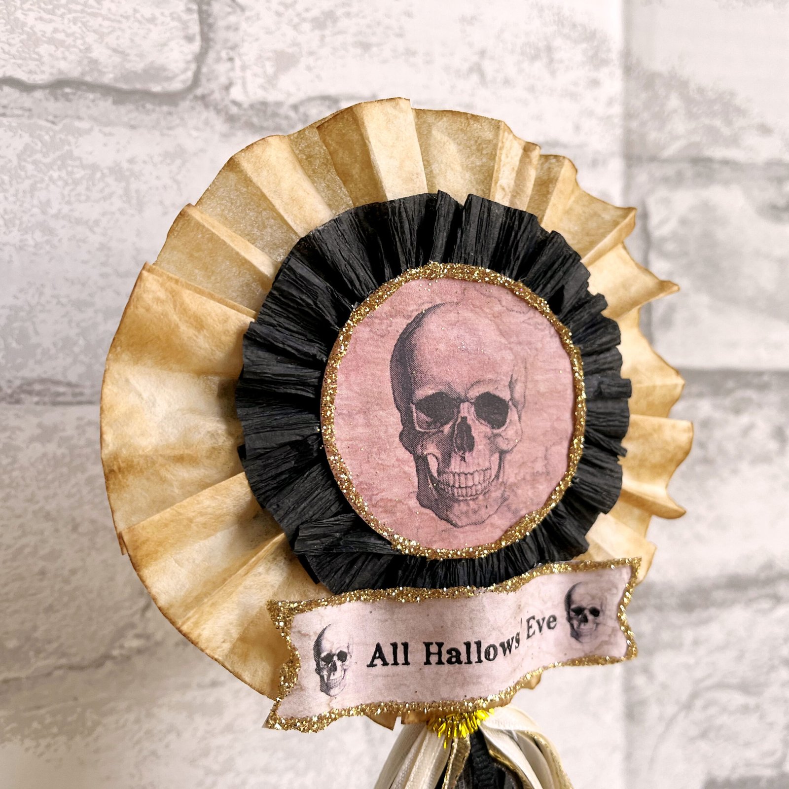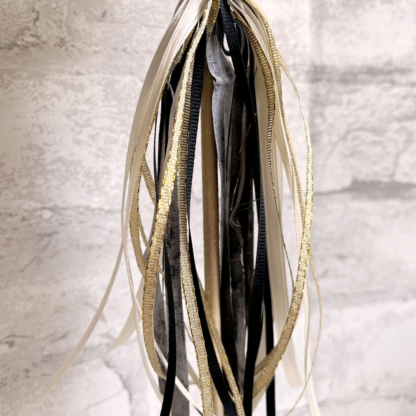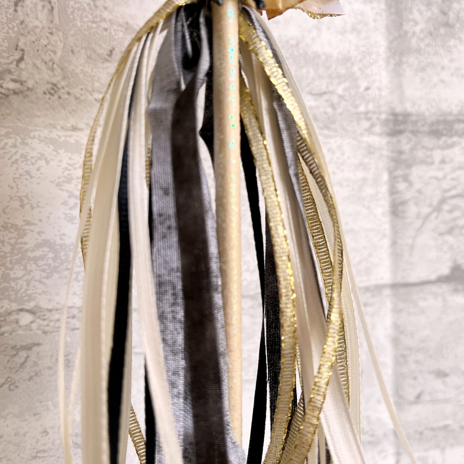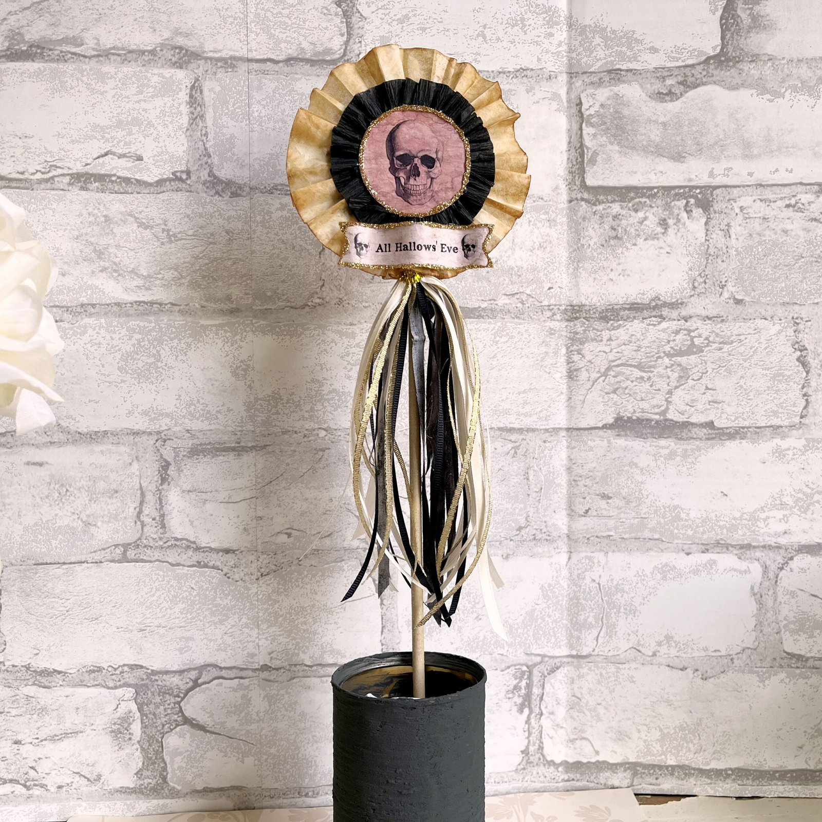 I absolutely Love how these turned out. This Vintage Style Halloween Faerie Wand features Coffee Stained coffee filters, Black Crepe Paper, Gold Glitter, Vintage Themed Graphic Images I created, Ribbons, Fabric and so much more. I hand glittered the edges of the Skull Image, the All Hallows’ Eve Banner and the Vintage French Writing image on the back. I hand ruffled/pleated the coffee filters and crepe paper. The extra long stick is painted in a Parchment color that is hand glittered, although I couldn’t get my camera to focus on it, but it is a clear holographic glitter that sparkles mostly green. I though it gave it that Eerie Vibe. The tassel is made from various Ribbons and thin strips of Fabrics in Blacks, Creams, Golds and Greys. On the back I even added a 3D Vintage plastic Bat that I have had in my collection since at least my first son was born. lol