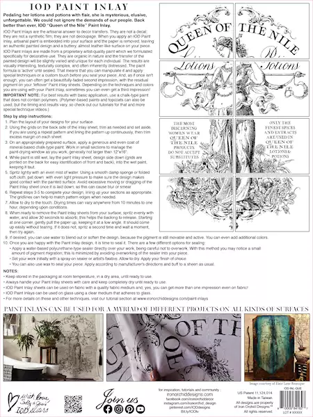 When you apply an IOD paint inlay, artisanal paint is embedded into your service in the paper is removed, leaving an authentic painted design and a buttery almost leather like surface on your piece. IOD paint and lays are made from a proprietary artist quality paint which we formulated specifically for decorative use. They are organic in nature and the transfer of the painted design will be slightly varied and unique for each individual.